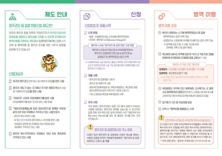 자세한 내용은 2026년도「영주권자 등 입영희망신청 제도」안내 리플릿(한■영본)을 참고하시기 바랍니다.