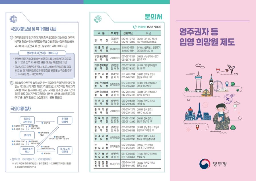 국방부에서는 국외영주권자 등 재외국민인 병사에 대하여 영주권을 유지할 수 있도록 거주국 방문을 보장하고 이에 소요되는 항공료 등을 국가에서 부담하는 정책을 운영하고 있습니다.